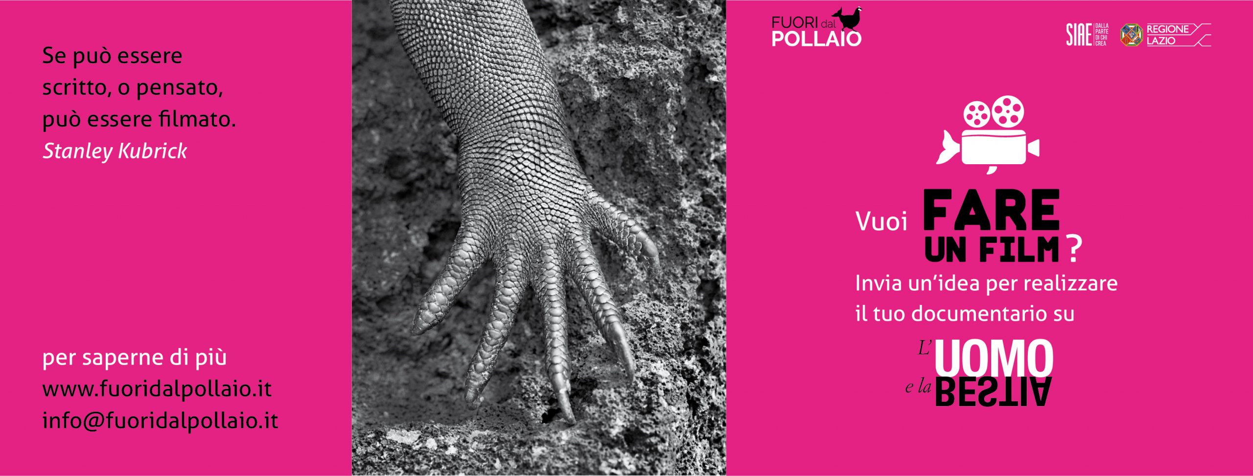FARE UN FILM è un progetto formativo, ideato e realizzato dall’ Associazione Fuori dal pollaio, con il contributo della SIAE – Società Italiana degli Autori ed Editori e della Regione Lazio, strutturato su attività di workshop e tutoraggio, dedicato all’ individuazione e al sostegno di autori, e di tutti i professionisti e non, che siano interessati a realizzare un film documentario sul tema L’UOMO E LA BESTIA.