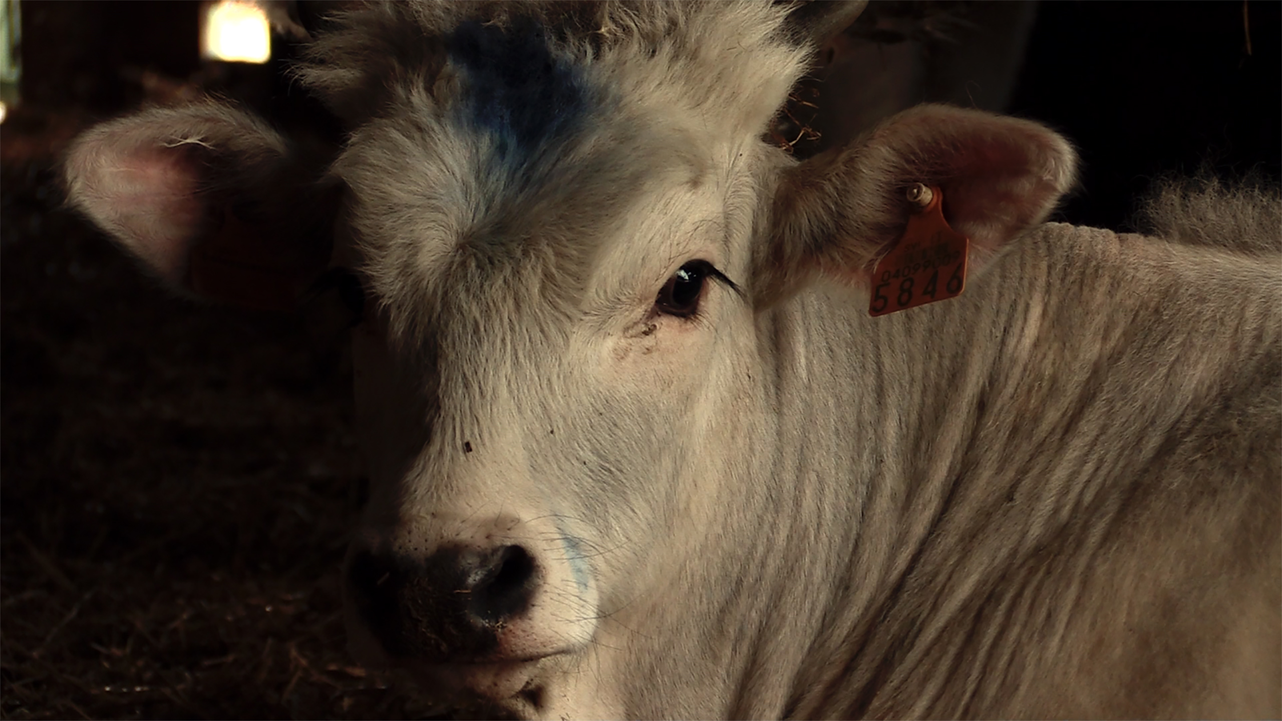 Il film parla di contraddizioni profonde, dell’attrazione per ciò che è oscuro. L’uomo che incarna tutto questo è uno zoonomo, un tecnico che segue allevamenti intensivi affinché producano il massimo, un gigante che entra in simbiosi con gli animali che accudisce: la testa sempre reclinata un po’ di lato, gli occhi che ruotano verso l’alto per rincorrere le immagini che narra, concrete e impastate di rumori e odori come le stalle che frequenta. Gli animali e la grande distribuzione sono la sua vita, che racconta come se non esistesse altro: la manza, la mucca chianina, la maremmana, la ricerca genetica delle sue forme, l’ingrasso e la fine inesorabile. Quest’uomo ci fa entrare in un mondo che svela le sue e le nostre contraddizioni, la crudezza dell’allevamento, il rapporto profondo con le bestie.
